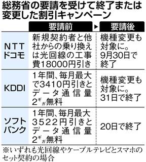 ソフトバンクは20日、携帯電話の新規加入者か番号持ち運び制度(MNP)利用者を対象とした割引「光でギガ特盛キャンペーン」の受け付けを終了した。NTTドコモやKDDIも相次いで割引キャンペーンの制度を変更。総務省が7月、携帯電話各社に過度な割引の是正を求めるガイドライン(指針)の順守を要請したことを受け、“正常化”を図った形だ。(大坪玲央)