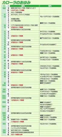 1966年11月に販売開始したカローラは、これまでに国内登録車のブランド別販売台数で合計36回もの年間首位を獲得した。ピークの73年には40万2000台を販売したものの、近年は消費者の嗜好(しこう)の多様化などにより、他のブランドに客が流れ、2015年の国内販売台数は前年比9%減の10万9000台と頭打ちが続く。