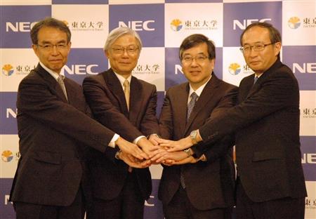 NECと東大は2日、人間の脳の動きをまねた超高効率の人工知能(AI)技術の共同研究を主軸とした戦略的パートナーシップ協定を締結したと発表した。日本の産業競争力の強化に向けた企業と大学による組織レベルの包括的な連携は、日立製作所もAIなどの分野で東大、京大などと進めており、今後も広がりそうだ。