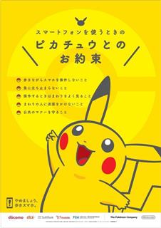 チラシとポスターには、ポケモンの人気キャラクター「ピカチュウ」が大きく描かれ、「スマートフォンを使うときのピカチュウとのお約束」として、歩きながらスマホを操作しない▽急に立ち止まらない▽操作するときはまわりをよく見る▽まわりの人に迷惑をかけない▽公共のマナーを守る-の5つが明記されている。