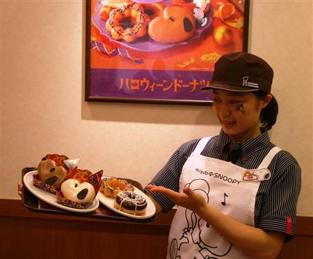ミスタードーナツは7日からハロウィーンにあわせて人気キャラクター「スヌーピー」とコラボした商品やフェイスペイントした店員が接客するといった取り組みを行う=5日、東京都新宿区【拡大】