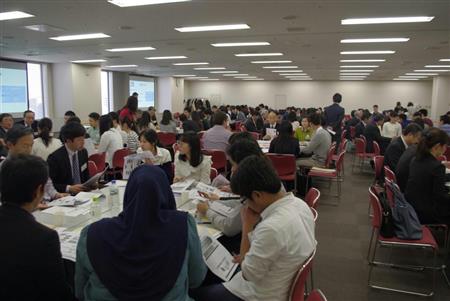 ASIALink主催の合同就職マッチング会「社長LIVE」。企業12社・留学生95人が参加した=3月4日、東京・両国【拡大】