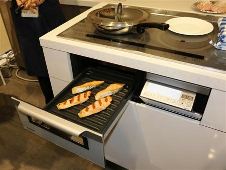 キッチンに組み込むビルトインタイプ。グリルでの自動調理メニューは「お急ぎ」「標準」「しっかり」の3コースから選べる。お急ぎコースでは、サンマ5尾の姿焼きの場合、調理時間は従来比12%減の約12分に短縮できる。