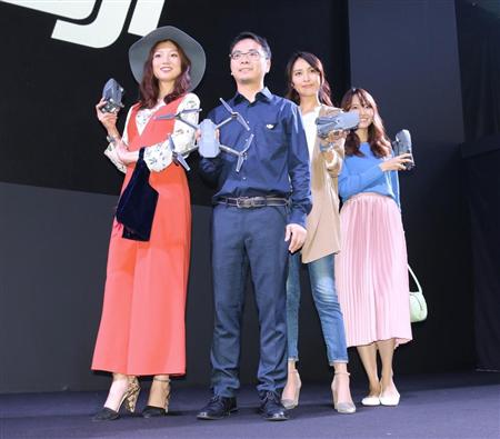 折りたたみ式の新型ドローンを披露するDJI日本法人の呉韜社長(左から2番目)ら=29日、東京都千代田区(宇野貴文撮影)【拡大】