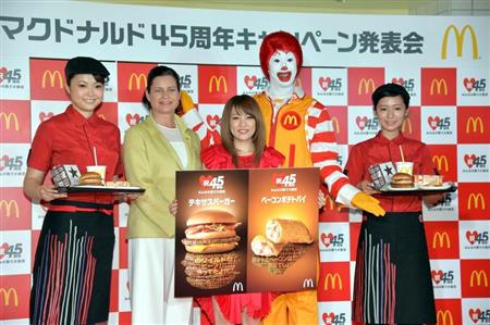 「日本マクドナルド45周年キャンペーン発表会」に出席した高橋みなみさん(左から3人目)とサラ・エル・カサノバ日本マクドナルド社長兼CEO(同2人目)=東京都新宿区【拡大】