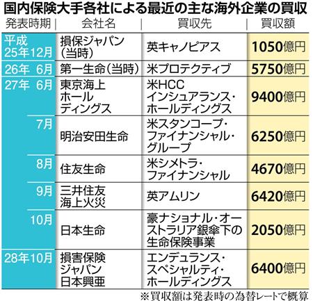 SOMPOホールディングス傘下の損害保険ジャパン日本興亜は5日、農家の収入を補償する農業保険で全米5位のシェアを持つ損害保険会社のエンデュランス・スペシャルティ・ホールディングスを約6400億円で買収すると発表した。来年1~3月に全株式を取得して、完全子会社化する。人口減で国内市場の縮小が見込まれるなか、生損保各社が活路を求める海外でのM&A(企業の合併・買収)が加速しそうだ。
