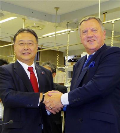 • 握手を交わすSOMPOホールディングスの桜田謙悟社長(左)とエンデュランスのシャーマンCEO=5日、東京都中央区