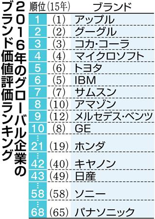 ブランドコンサルティング会社の米インターブランドは5日、2016年のグローバル企業のブランド価値評価ランキングを発表した。トヨタ自動車が前年から順位を1つ上げて過去最高の5位に入り、日本勢首位の座を保った。100位以内の日本企業は前年と同じ6社で、顔ぶれも変わらなかった。全体の首位は米アップル、2位は米グーグルで、ともに4年連続。