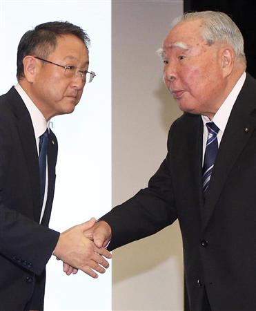 トヨタとスズキによる業務提携の検討開始に関する発表会見は、トヨタの豊田章男社長とスズキの鈴木修会長が出席し、12日午後6時半から東京都文京区のトヨタ東京本社で開かれた。