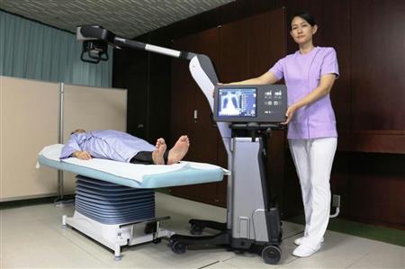 救急、集中医療室といったスペースが限られる医療現場で活用でき、交通事故で緊急搬送された患者の骨折や内出血を調べる際などに役立つ。2016年度に100台の受注獲得を目指す。