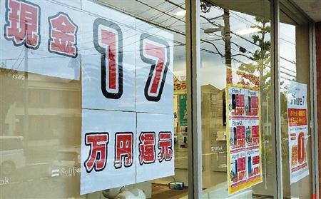 「現金17万円還元」を掲げた都内のソフトバンク販売店【拡大】