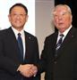 記者会見するトヨタ自動車の豊田章男社長(左)とスズキの鈴木修会長=12日、東京都文京区【拡大】