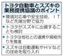 トヨタ自動車とスズキは12日、業務提携の検討を始めたと発表した。自動運転など安全技術や環境対応車、インターネットに接続する「つながるクルマ」の開発のほか、欧米に後れを取る規格づくりやインフラ整備などで協力する見込み。先端技術の開発競争が激しくなる中、他社にも提携参加を呼び掛けて主導権を握りたい考えだ。