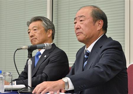 会見する出光興産の月岡隆社長(右)と昭和シェル石油の亀岡剛社長=13日午後、東京都千代田区(宮崎瑞穂撮影)【拡大】