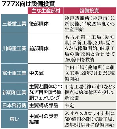 大規模受注をにらみ、ほかの日本メーカーも設備投資に踏み切っている。東レは昨年11月に主翼材の炭素繊維複合材を10年間供給する契約を正式に締結。米サウスカロライナ州に新工場を建設し、中型機「787」向けも含めた受注総額は110億ドル(約1兆1440億円)に上る見通しだ。