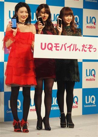 UQコミュニケーションズの発表会で新型スマートフォンをPRする、永野芽郁さん、深田恭子さん、多部未華子さん(左から)=24日、東京都港区【拡大】
