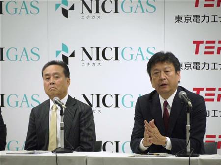 東電EPとLPガス大手日本瓦斯の提携会見。東電は着々と家庭用ガス販売の準備を進める=5月、東京都千代田区【拡大】