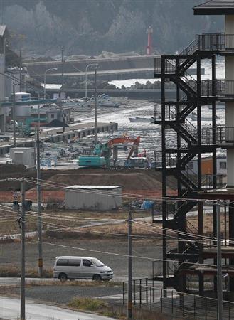 【福島県で震度5弱津】避難勧告が発令され、田老港から避難する車両=22日午前8時18分、岩手県宮古市(大西正純撮影)【拡大】