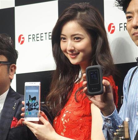 プラスワン・マーケティングの展開する格安スマホブランド「フリーテル」のイメージキャラクターを務める佐々木希さんが新端末をPRした=21日、東京都中央区【拡大】