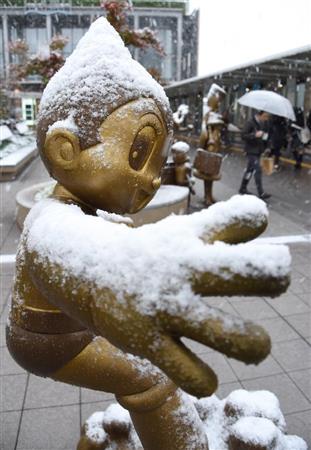 鉄腕アトムにも積雪=24日午前7時41分、東京都練馬区の西武池袋線大泉学園駅(酒巻俊介撮影)【拡大】