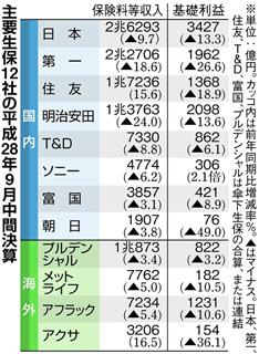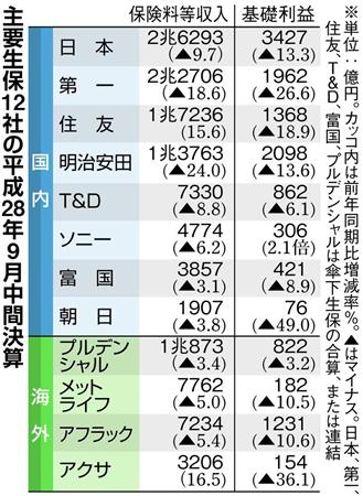 主要生命保険12社の平成28年9月中間連結決算が24日、出そろった。売上高に相当する保険料等収入は10社が減収。超低金利のあおりで一部商品の販売を抑制したことが響いた。本業のもうけを示す基礎利益は円高が重しとなり、11社が減益だった。米大統領選後は相場が一転し金利上昇と円安が続く。各社は当面、市場環境に振り回されそうだ。