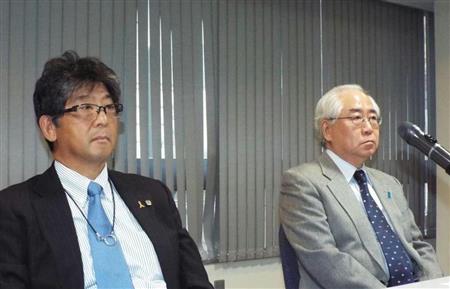 厳しい表情で記者会見に臨む全日遊連の阿部恭久理事長(左)【拡大】