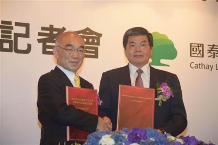 桃園市での水族館事業の契約書を交わした横浜八景島の布留川信行社長(左)と、国泰人寿の親会社、国泰金控の李長庚総経理(社長)=28日、台北市【拡大】