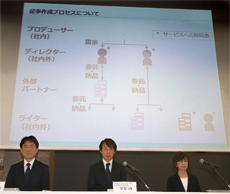 • まとめサイトの無断転用等の問題を受け会見したディー・エヌ・エーの(左から)小林賢治経営企画本部長、守安功社長、南場智子会長=7日午後、東京都渋谷区(桐山弘太撮影)