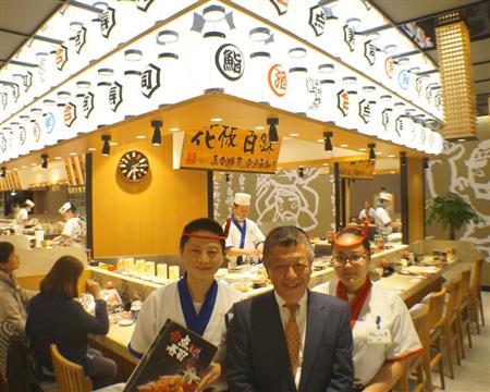 上海市内と江蘇省蘇州市に合わせて11店舗を、いずれも直営で運営する「がってん寿司(中国語名は合点寿司)」。2008年11月に1号店を上海市内で開店し、現在1店舗1日当たり100~200人の来店客がある。従業員は約200人を抱える。上海法人の倉地厚・董事長兼総経理(会長兼社長)は「売上高ベースで年間20%前後の拡大が続いている」と話した。