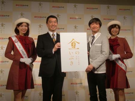 みやぎライシーレディとともに宮城県産のプレミアム玄米「金のいぶき」のブランドロゴをお披露目する村井嘉浩・宮城県知事(中央左)とアートディレクターの水口克夫さん(同右)【拡大】