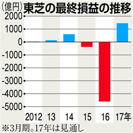 東芝は不正会計問題に伴う事業見直しなどで16年3月期は最終損益で4600億円の赤字に陥った。17年3月期は半導体メモリーが好調で業績予想の上方修正を続けてきたが、半導体と並ぶ再建の柱に据える原子力事業が足を引っ張る事態となった。