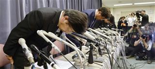 燃費不正問題の調査状況を国交省に報告後、記者会見で謝罪する(手前から)三菱自動車の相川哲郎社長、益子修会長ら(肩書は当時)=5月、東京・霞が関の国交省【拡大】