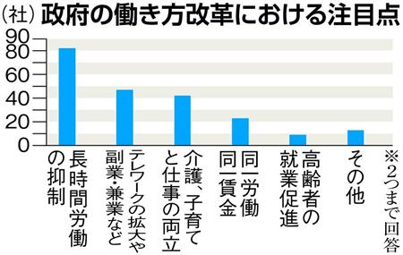政府が進める働き方改革で、企業が注目するのは「長時間労働の抑制」が38%と最も高く、「テレワークの拡大や副業・兼業などの柔軟な働き方」(22%)、「病気の治療、介護、子育てと仕事の両立」(19%)が続いた。国会でも議論される残業時間の上限規制など長時間労働の抑制については「柔軟な働き方の推進で時間外労働の削減は重要」(電力)、「生産性向上と有能な人材の確保につながる」(小売り)などと、肯定的な意見が多かった。