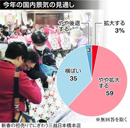 主要企業122社へのアンケートで、2017年の国内景気見通しについて「拡大」「やや拡大」とする回答が6割強に上り、景気は拡大傾向との見方が過半を占めた。ただ、15、16年の同時期の調査はそれぞれ計8割強の企業が拡大を見込んでおり、全体の景況感には減速の兆しもある。回答からはトランプ次期米大統領の政策手腕や中国の経済減速に対する不安が垣間見えた。