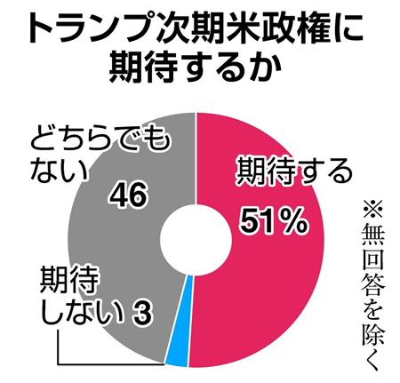 トランプ次期米政権に「期待する」との回答が51%だったのに対し、「期待しない」は3%にとどまった。「どちらでもない」は46%だった。