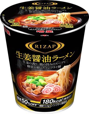 RIZAP辛味噌ラーメンは、ノンフライ麺に唐辛子の辛みがきいた濃厚な味噌スープを合わせ、糖質量を一般的なカップ麺の50%以下に仕上げた。価格は268円。RIZAP生姜醤油ラーメンも生姜の香りをきかせたチキンスープを採用し、糖質量を50%以下とした。価格は205円。