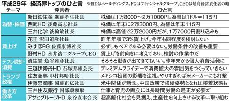 為替も1ドル=110円を超える円高の想定はなく、115~120円程度が主な予測だ。「トランプ政策次第」(神戸製鋼所の川崎博也会長兼社長)で、乱高下することも想定されるが、サントリーホールディングス(HD)の新浪剛史社長が「トランプ政権は日本にとっていい機運をもたらす」と語るなど、期待の方が大きい。