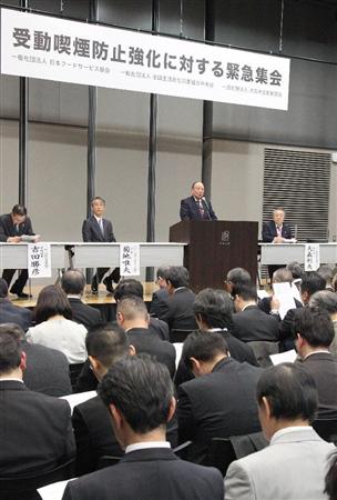 日本フードサービス協会は12日、全国生活衛生同業組合中央会などとの共催で「受動喫煙防止強化に対する緊急集会」を東京都内で開き=写真(菊本和人撮影)、「一律に『原則建物内禁煙』を課すことなく、自主的な取り組みについて理解と支援と賛同を求める」との決議を採択した。
