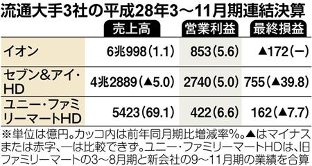流通大手3社の平成28年3~11月期連結決算が12日、出そろった。総合スーパーの不振でイオンが3~11月期としては2年連続の最終赤字となり、セブン&アイ・ホールディングス(HD)とユニー・ファミリーマートHDも最終減益だった。各社は不採算店舗の閉鎖や改装など構造改革を進めており、収益改善を急ぐ。