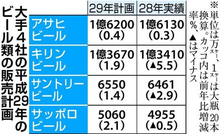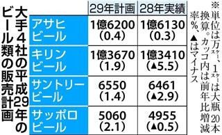 大手ビール4社の平成29年のビール類の販売計画が12日、出そろった。酒税の一本化を見据え、各社は減税されるビールに力を入れる方針だ。だが、節約志向を背景に、割安な発泡酒や第3のビールの人気も根強い。酒税の一本化は38年と先のため、短期的には各社とも発泡酒や第3のビールもこれまで通り展開する“二正面作戦”の構えだ。(大柳聡庸、写真も)