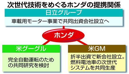 独立志向が強いといわれるホンダだが、昨年12月に米グーグルと完全自動運転のための共同研究の検討を発表。今年1月には、米ゼネラル・モーターズ(GM)と、燃料電池車の基幹部品の共同生産を打ち出した。市場では「ホンダの経営が変わってきた」(三菱UFJモルガン・スタンレー証券の杉本浩一シニアアナリスト)との評判がもっぱらだ。