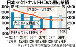 日本マクドナルドホールディングス(HD)が9日発表した2016年12月期の連結決算は、最終損益が53億円の黒字(前期は349億円の赤字)と、3年ぶりに黒字転換した。14年夏の期限切れ鶏肉使用の問題以降、業績が低迷していたが、期間限定商品や店舗改装といった施策を相次ぎ打ち出し、客足が戻りつつある。ただ、店舗数は減少傾向で、今後の成長力には課題を残す。