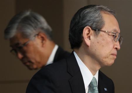 会見する東芝の綱川智社長(右)と佐藤良二監査委員会委員長=14日午後、東京都港区(古厩正樹撮影)【拡大】