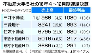 不動産大手5社の2016年4~12月期連結決算が14日までに、出そろった。三井不動産など4社が増益だった。日銀のマイナス金利政策による低金利の影響で不動産市況が押し上げられ、物件の売却益などが増えた。