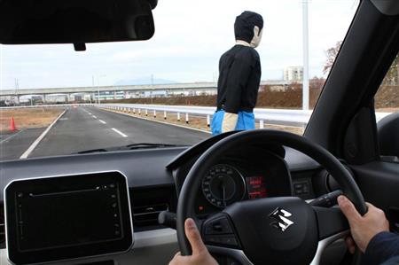 時速30キロで走行中、飛び出した人形の手前で停止したスズキの自動ブレーキ搭載車=2016年12月1日、茨城県つくば市の日本自動車研究所【拡大】
