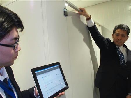 トイレの空き状況の把握は、個室のドアに設置したセンサーがドアの開閉を確認し、近距離無線通信「ブルートゥース」やインターネットを通して、離れた所にいる人のスマートフォンなどに、ドアが開いている場合は「空室」、閉まっている場合は「満室」と伝える。月額サービス使用料は個室単位で450円で、設置作業費用なども必要となる。