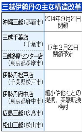 大西氏は昨年11月、機関決定していないにもかかわらず、伊勢丹の松戸店(千葉県松戸市)と府中店(東京都府中市)、松山三越(松山市)、広島三越(広島市)の4店を構造改革の対象に挙げた。