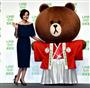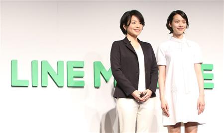 ラインモバイルの記者発表会で、嘉戸彩乃社長(左)と並んだ女優ののんさん=14日、東京都千代田区(荻窪佳撮影)【拡大】