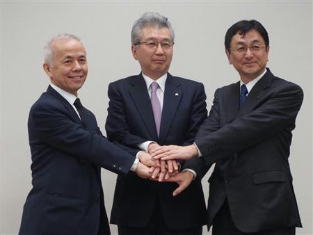 火力発電事業の完全統合で基本合意した東電HDの広瀬直己社長(左端)と中部電力の勝野哲社長(中央)ら=28日、東京都中央区【拡大】
