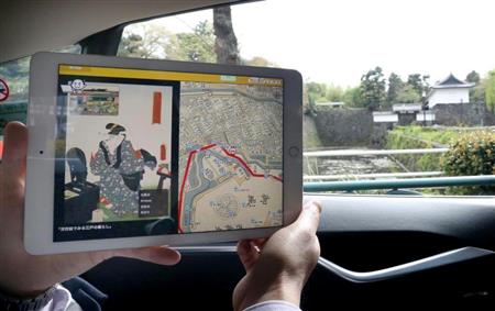 日の丸リムジン(東京都文京区)が今月から、「タイムスリップタクシー」と名付けた新サービスを開始し、訪日外国人客や歴史ファンの話題を呼んでいる。タクシーで都内の歴史スポットを回りながら、タブレット端末に映し出される古地図や浮世絵などをガイド音声付きで鑑賞し、江戸の街並みや風俗を感じてもらう趣向だ。